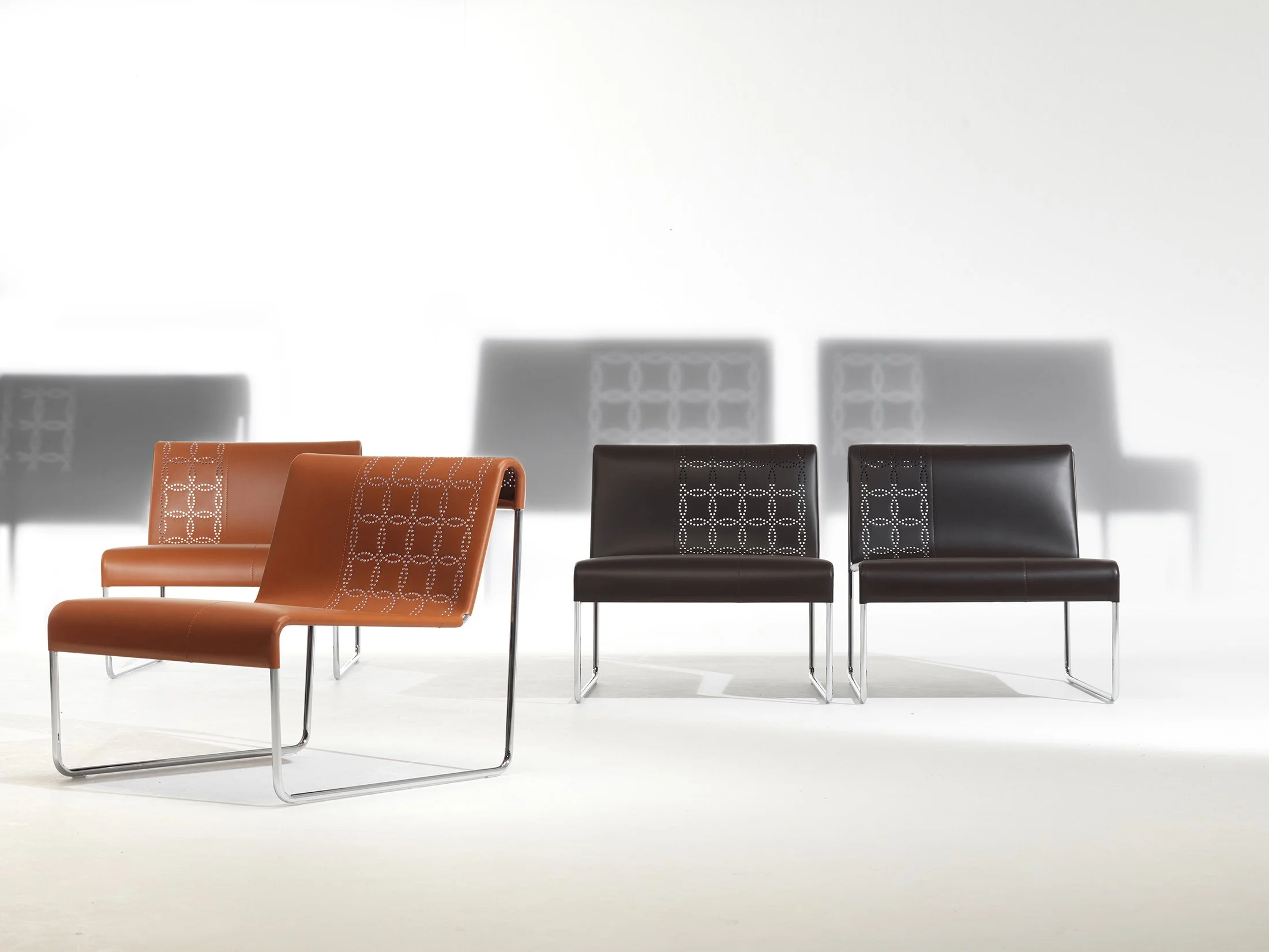 A tubular metal frame dressed in a sophisticated two-color full grain leather “garment”, where the stern and perfect geometry of a laser-cut perforated circle is the only decorative detail allowed, apart from the unrestrained use of two colors. The well-fitting effect of the cover turns it into a self-supporting element, making the metal support all but disappear and turning the material into the design’s undisputed main actor.