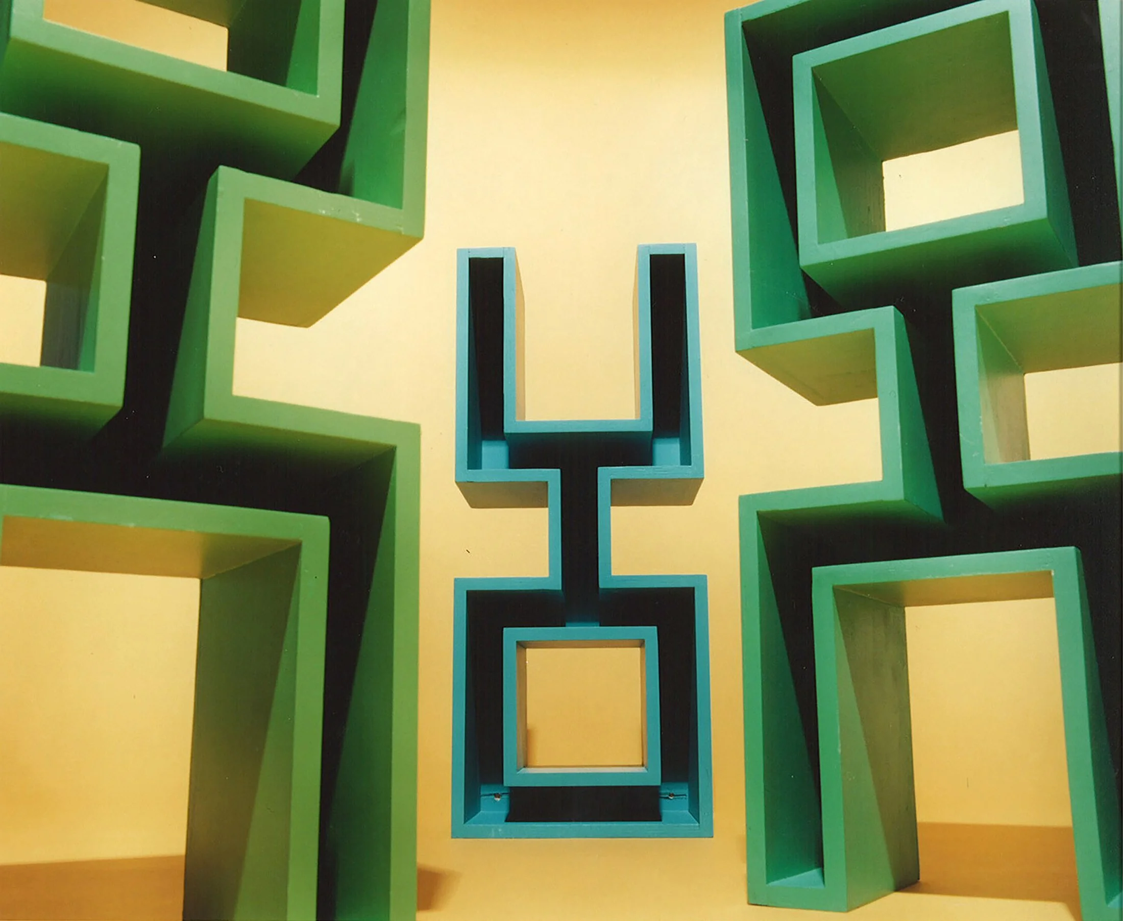 Shelves in coloured transparent acrylic glass and lacquered wood.